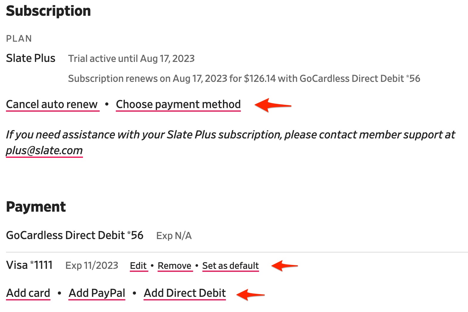 - click the link “Choose payment method” in the Subscription section, then choose the bank account